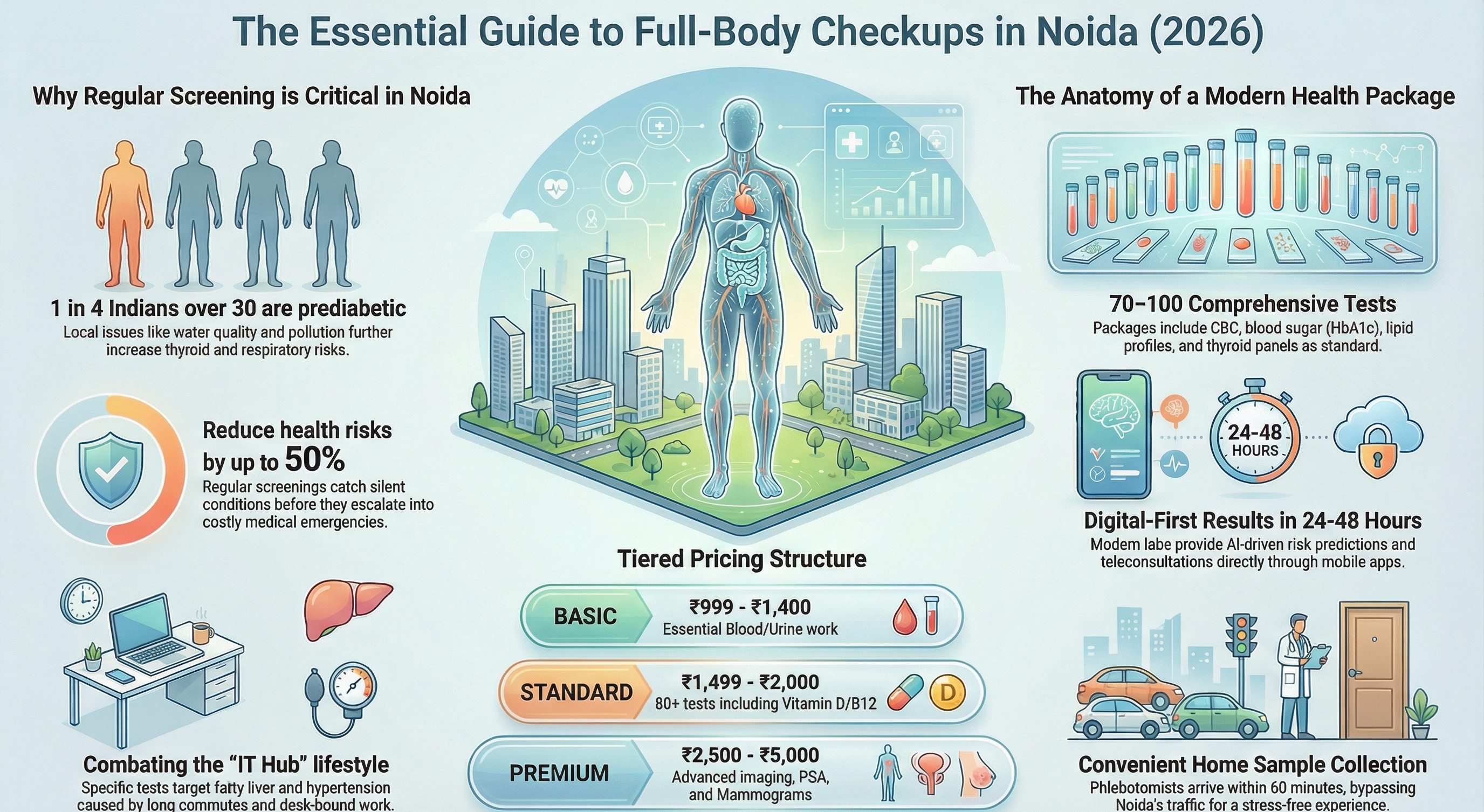 Delve deeper: Preparation involves 10-12 hour fasting, hydration, and listing medications. Post-test, lifestyle tweaks based on results—like more greens for low vitamins—yield quick wins. Full body checkup in Greater Noida packages often include consultations to interpret findings.