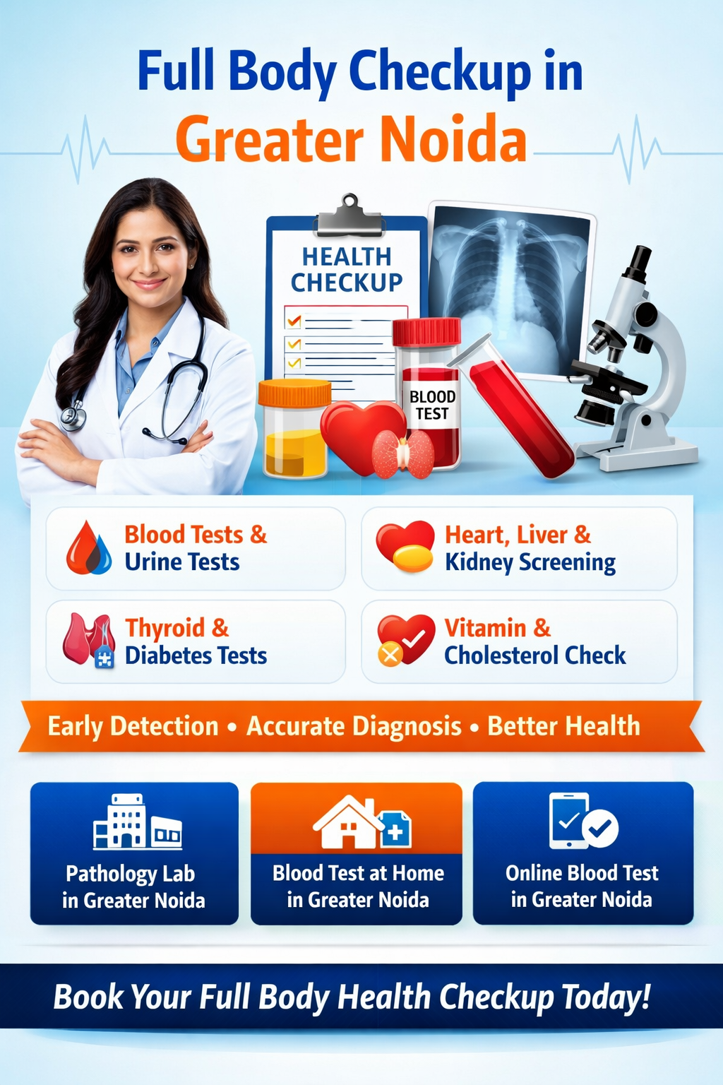 A Full Body Health Checkup in Greater Noida is a comprehensive diagnostic package designed to evaluate your overall health. It includes a variety of blood tests, urine tests, and sometimes imaging procedures to detect potential health problems at an early stage.
